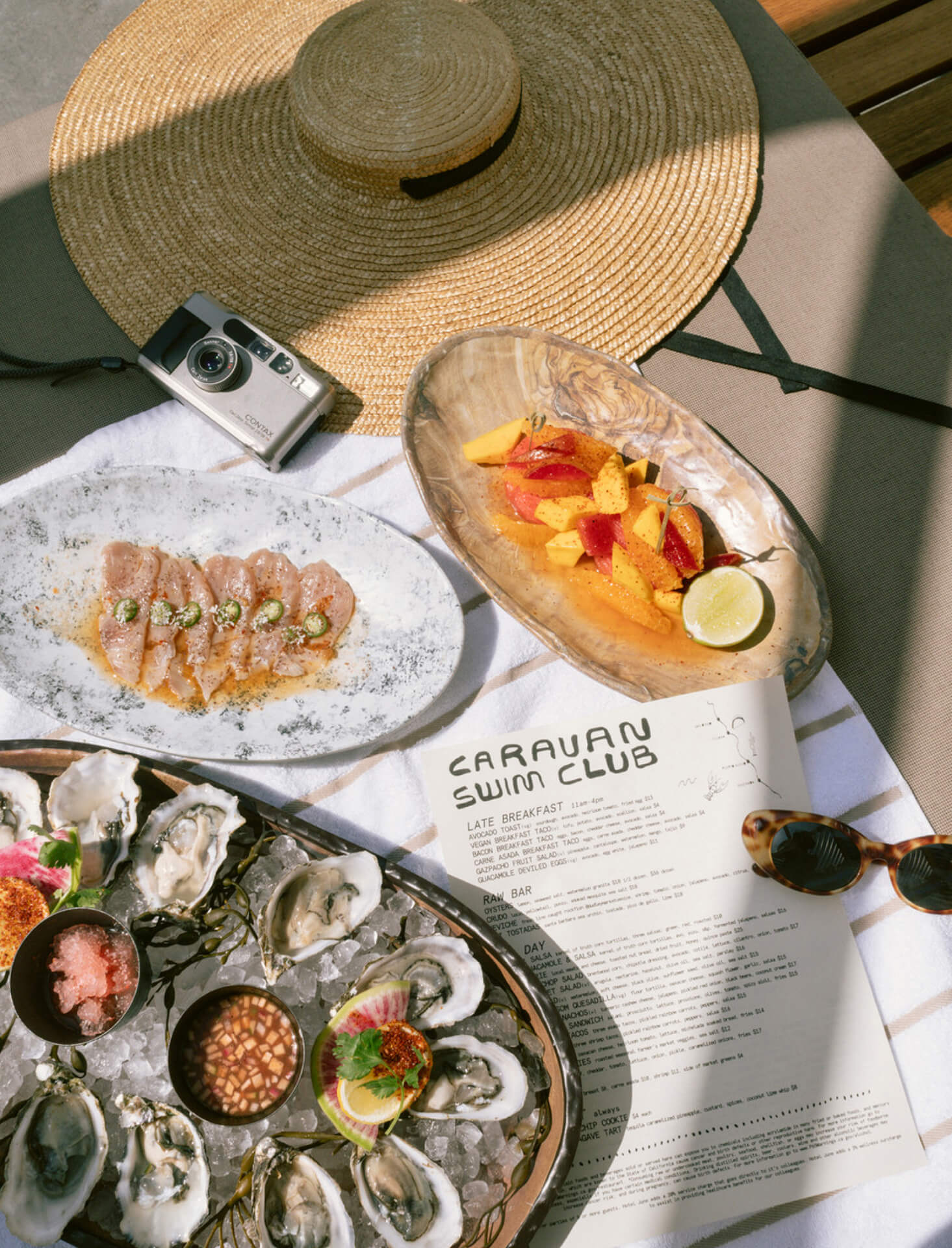 Caravan Swim Club is Hotel June’s breezy, Baja-inspired poolside restaurant and bar—a sun-soaked hideaway serving fresh coastal cuisine, natural wines, and spirited cocktails from day to night. Think fish tacos by the fire pit, golden hour gatherings, and a laid-back vibe that captures the essence of Westside summer, all year long.